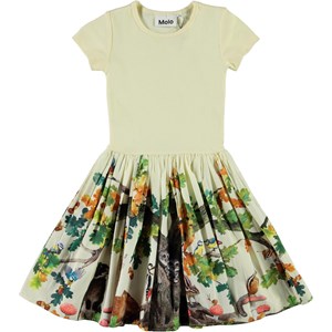 Cissa är en tvådelad gul klänning med en kortärmad ribbad topp. Nederdelen har ett tryck av skogen och dens djur.
