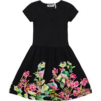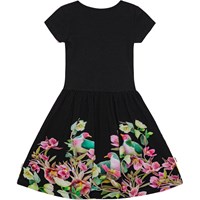 Svart kortärmad klänning i ekologisk bomull med en rundskuren kjol. Toppen är tight i en ribbad trikå, medan kjolen är i en slät trikå. Klänningens kjol har ett tryck av rosa och vita blommor med färgglada fåglar i matchande färger.