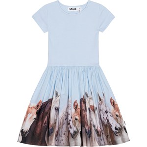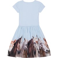 Blå kortärmad klänning med rundad kjol i ekologisk bomull. Toppen är i ribbad jersey och tight, medan kjolen är i bomullsjesrey med ett mönster av hästar ivita och bruna nyanser.