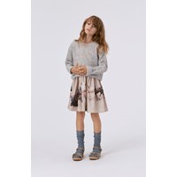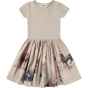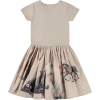Beige knälång kortärmad klänning med poplinkjol med hästar. Här ser du en hästfamilj av söta ponnys som antingen står, springer eller ligger och vilar. Denna klänning är tillverkad i 100% bomull, har rund hals, korta ärmar, poplinkjol med mycket volym och en smal passform.
