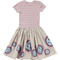 Cissa är en kortärmad klänning med rundad kjol i ekologisk bomull. Upptill är Cissa i ribbad jersey i sandfärg med rosa ränder, medan kjolen är i bomullspoplin. På kjolen är det spraymålade smileys i blå och rosa.