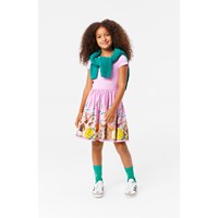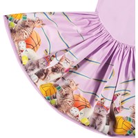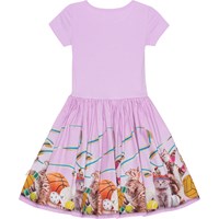 Rosa kortärmad klänning i ekologisk bomull för de små. Toppen är åtsittande i en ribbad jersey, medan kjolen är i slät jersey. Trycket på kjolen visar kattungar i sportkläder omgivna av bollar och förmedlar ett budskap om hur sport och lek kan berika vänskap och relationer.
