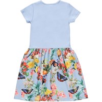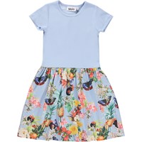 Cissa är en kortärmad klänning med rundad kjol i ekologisk bomull. Upptill är Cissa i ribbad jersey, medan kjolen är i bomullspoplin. På kjolen är det rankor med tropiska frukter, blommor och fjärilar. Celia är en kortärmad klänning i ekologisk bomullsjersey. Klänningen har en kant vid hals och axlar med påsydd volang somgår hela vägen runt och bildar klänningens ärmar. Celia är här med rosor över hela klänningen.