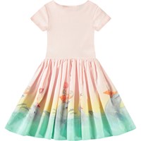 Rosa kortärmad klänning i ekologisk bomull med en åtsittande ribbad jerseytopp och poplinskjol. Klänningen har en normal passform med ett färgglatt mönster av lekfulla delfiner i havet på kjolen.