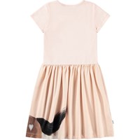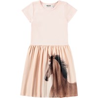 Rosa kortärmad klänning i mjuk ekologisk bomull. Toppen har en åtsittande passform i ribbad jersey, och kjolen är gjord av en stretchig jersey med ett charmigt mönster av en häst. Det är en bekväm och festlig klänning med gott om utrymme för rörelse.