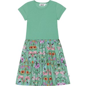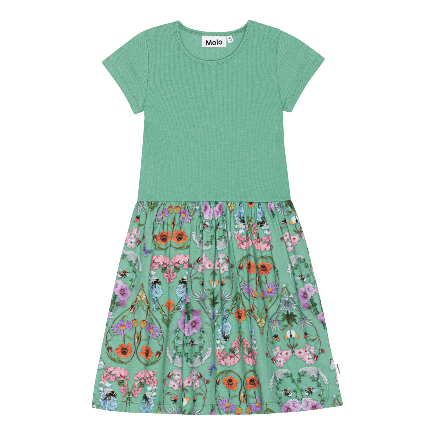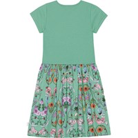 Kortärmad grön klänning med rundad kjol i ekologisk bomull. Toppen är tight i ribbad jersey, vilket gör den enkel att ta på och skön att ha på. Kjolen är i bomullspoplin och har ett mönster av insekter och vilda blommor som bildar hjärtan.