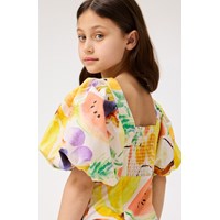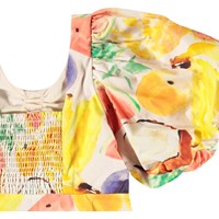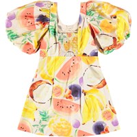 Beige klänning i ekologisk bomull med ett mönster av färgglada exotiska frukter och puffärmar. Klänningen har en åtsittande topp med en rosett detalj över bröstet och en osynlig dragkedja under armen, vilket gör det enkelt att ta på och av den. Kjolen är A-linjeformad och faller till mitten av låret.