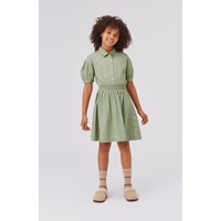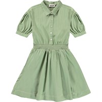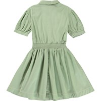Claudette är en grön skjortklänning med gummiband i midjan. Klänningen har krage, korta ärmar och knappar framtill.