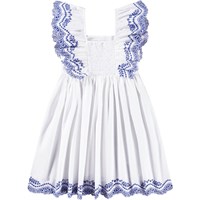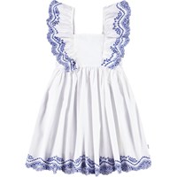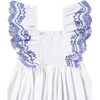 Vit knälång klänning i ekologisk bomull med broderie anglaise på kjolen och en volang över axeln. Klänningens överdel har en åtsittande form, volangdetalj på ärmarna med resår och en smockeffekt på baksidan, vilket gör den lätt att ta på sig.