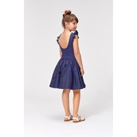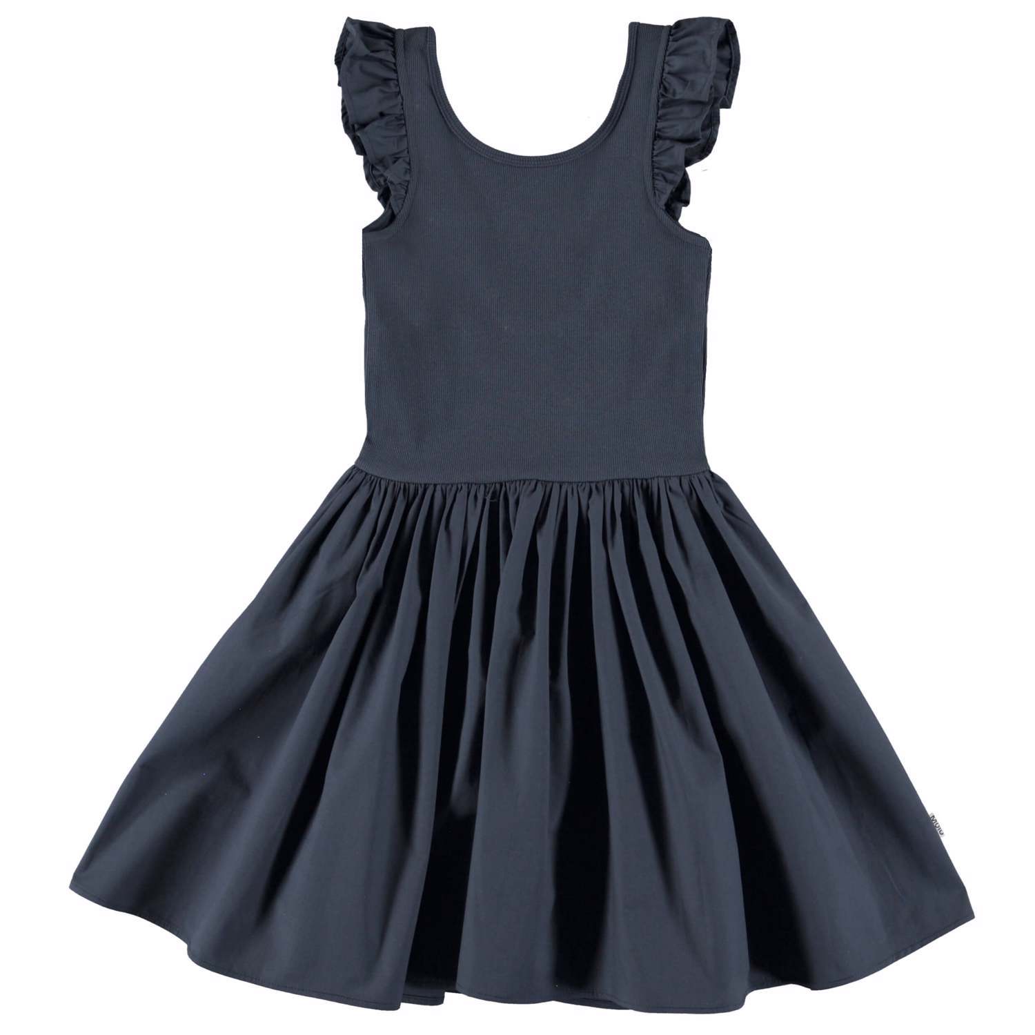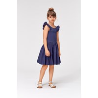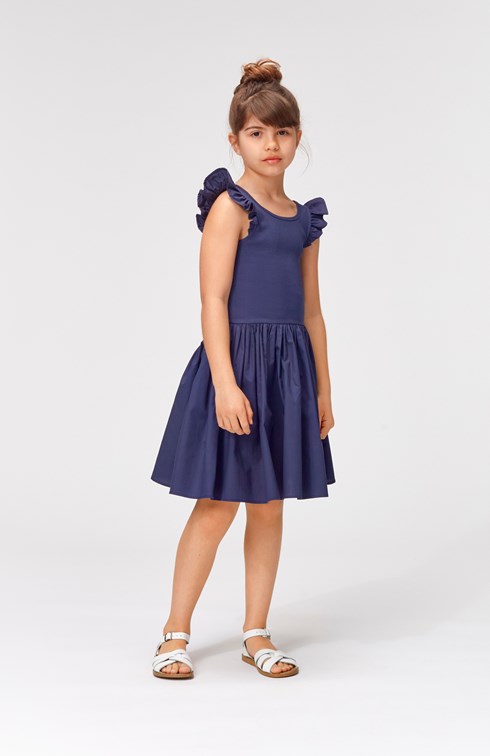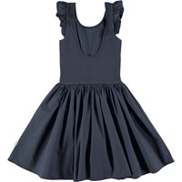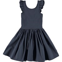 Cloudia är en mörkblå klänning utan ärmar där överdelen är i ribb med små volangkanter på axlarna. Klänningens kjol är i poplin som har en fin volym.