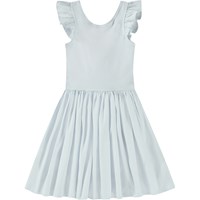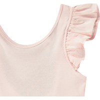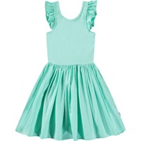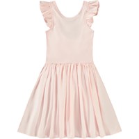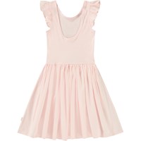 Rosa knälång klänning i ekologisk bomull med en poplin kjol. Klänningens överdel är i en åtsittande bomullsribb, har volanger på axlarna och en djup urringning i ryggen.