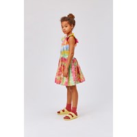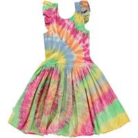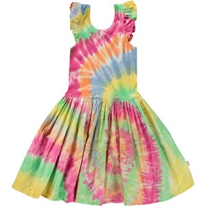 Cloudia är en knälång klänning i multifärgad tie-dye och ekologisk bomull. Klänningen har en rundad kjol och volanger vid axlarna i poplin. Toppen är ribbad jersey och har en djupare urringning i ryggen.