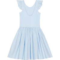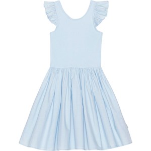 Blå knälång klänning i ekologisk bomull. Klänningen har rundad kjol och volanger vid axlarna i poplin. Toppen är ribbad jersey och har en djupare ringning i ryggen.