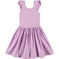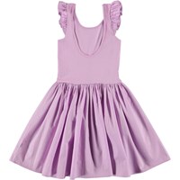 Cloudia är en ljuslila klänning utan ärmar där överdelen är i ribb med små volangkanter på axlarna. Klänningens kjol är i poplin som har en fin volym.