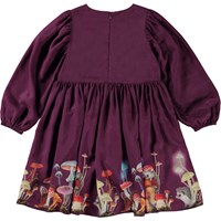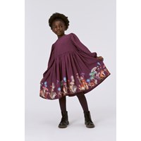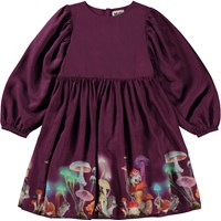 Mörklila knälång klänning med mönster nertill på kjolen. Här visas vad som händer på natten i månens trädgård, En trädgård där blommorna blommar efetr solen gått ner. Blommor med namn som nattens drottning, änglatrumpet, nattljus och nattblommande jasmin. Ett ställe där äventyrslystna djur hänger. Varg och lamm, uggla och fjäril, isbjörn och grönögda katter, kaninungar och rådjurskid. Gigantiska svampar, stora som träd och luften fylld av nattens ljud. Denna klänning är tillverkad i 100% viskos, har en rund hals, dold dragkedja i ryggen, höjd midja, massor av volym på de långa ärmarna och en lös passform.