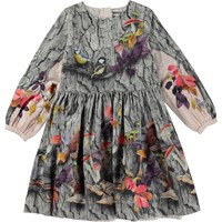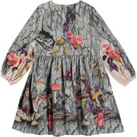 jusgrå knälång klänning med placerat mönster. I detta mönster kan man vara ett med naturen och leva sig in i att vara både ett djur eller en växt. Trädstammen står tryggt rotat med alla skgogens djur, växter och svampar som inneboende. Ärmarna är grenar som både kan omfamna världen och sträcka sig mot himlen. Denna klänning är tillverkad i 100% bomull, har rund hals, dold dragkedja i ryggen, långa ärmar och kjol med massor av volym och en norml passform.