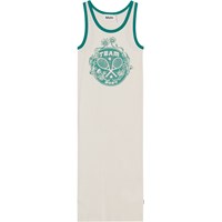 Råvit tight klänning i ekologisk bomull. Klänningen har gröna kantband vid hals och ärmöppningar som matchar mönstret framtill. Mönstret ar en logga med "Team 2024", tennisracket och blommor.
