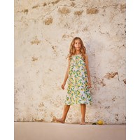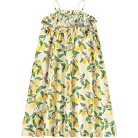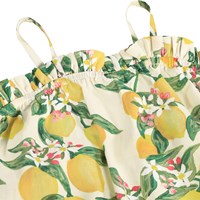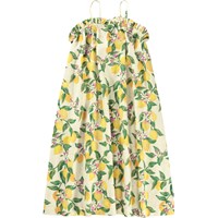 Lös klänning med citrusmönster i lätt, ekologisk bomull. Klänningen når till mitten av vaden, har tunna axelband och en volangkant. Perfekt för en dag på stranden eller vid poolen.
