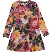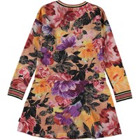 Rosa och lila knälång klänning med blommigt mönster. Mönstret är handmålade blommor och om du tittar efter riktigt noga kan du se penseldragen. Detta mönster r speciellt då det är Molo´s egen och nya version av ett mönster som skapades på en silkesmölla i Lyon i Frankrike. En plats som har jobbat med alla de stora namnen som t.ex. Givenchy, Balenciaga, Chanel, Dior och nu också, Molo kids. Denna klänning är tillverkad i 100% bomull, har rund hals med randig ribbkant, långa ärmar med randig ribbkant, kjol med A-form och en normal passform.