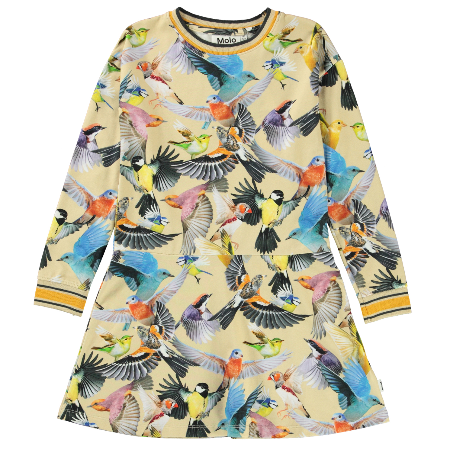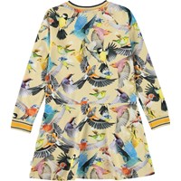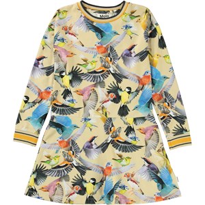 Conny är en ljusgul klänning med olika fåglar i fina färger. Klänningen har långa ärmar och randig ribbkant vid hals och ärmslut.