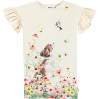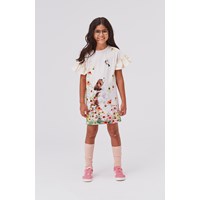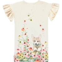 Coralie är en t-shirtklänning med små volangärmar. Klänningen har ett mönster med hundar i blomsterängen både fram och bak.