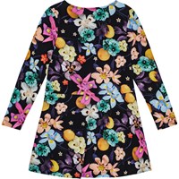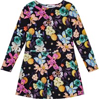 Svart långärmad klänning i stretchbar ekologisk bomull med en rund hals, åtsittande ärmar och topp. Klänningen har en lös passform och når till mitten av knäet, samt är lätt att ta på sig och bekväm att ha på. Den har ett tryck av färgglada blommor i livfulla nyanser, som framträder vackert mot den svarta bakgrunden.