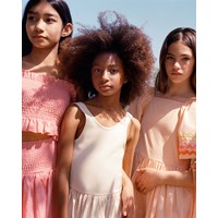 Beige klänning i ekologisk bomull med en volyminös poplinskjol. Klänningens överdel är åtsittande med en rund hals, en djup rygg och är ärmlös.