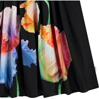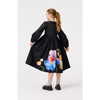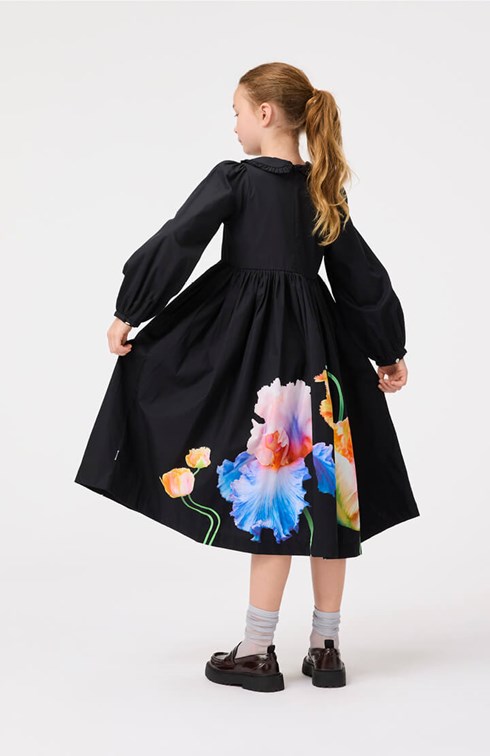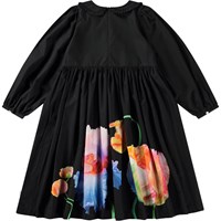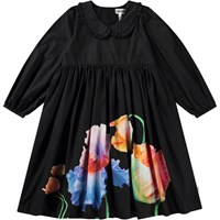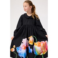 Svart knälång klänning i ekologisk bomull med krage och volangkant. Klänningen har en lös passform, långa ärmar med knäppning vid handlederna och en osynlig dragkedja i ryggen för enkel av- och påtagning. Kjolen är volyminös med ett färgglatt mönster av konstnärliga tulpaner.