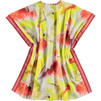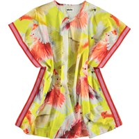 Corliss är en luftig kaftanklänning perfekt till sommar värmen. Klänningen är gul med färgglada papegojor, samt randigt kantband, vilket ger fin kontrast.