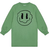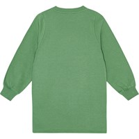 Multifärgad jerseyklänning i en mjuk bomullsblandning med en lös passform. Klänningen har ribbade kanter vid halsen och ärmarna, samt en oborstad insida som gör den behagligt sval på en varm dag. Det övergripande trycket består av flytande graffiti-ränder i nyanser av grönt, blått, gult och rosa.