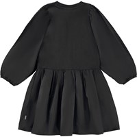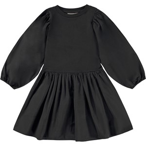 Svart knälång klänning med poplinärmar och kjol. Denna klänning är tillverkad i 100% bomull, har en rund hals med ribbkant, långa ärmar med volym och gummiband, en rynkad kjol med massor av snurr i och en normal passform.