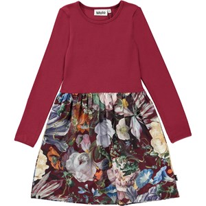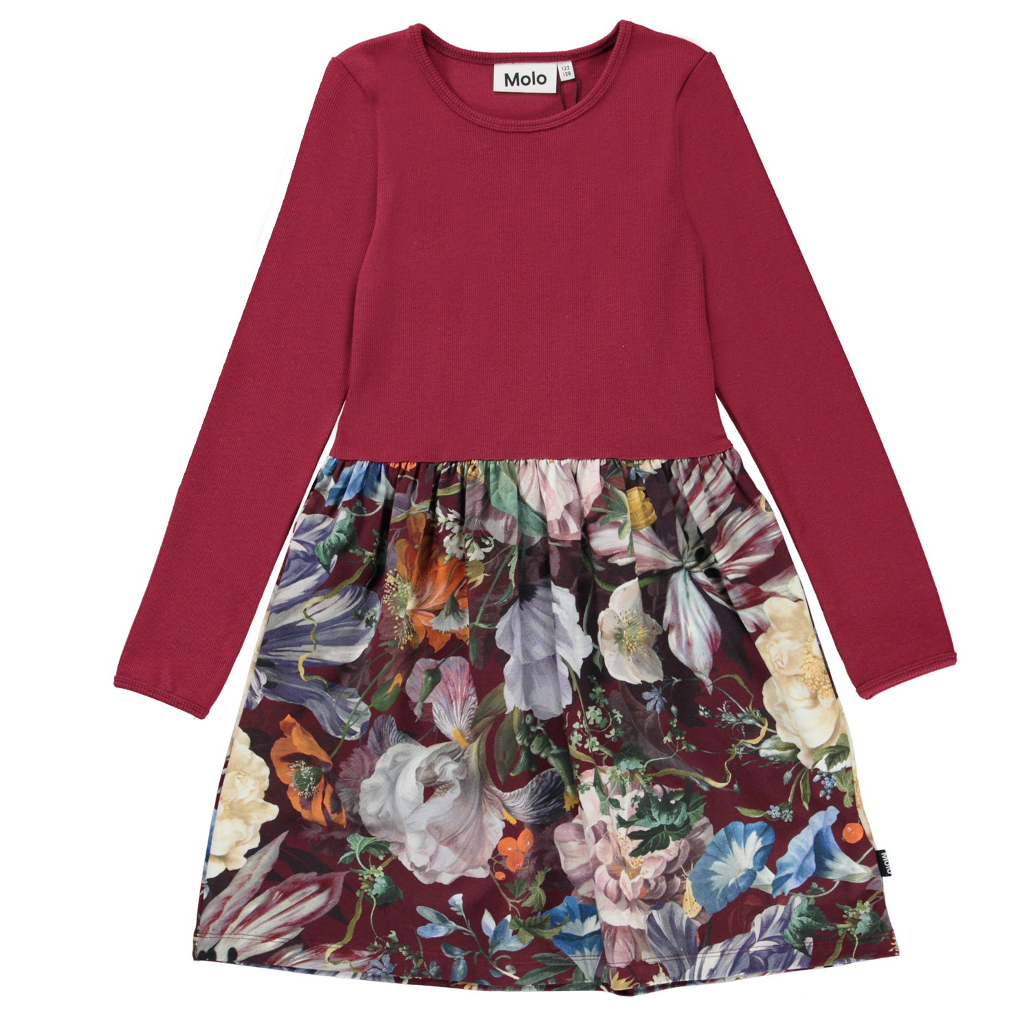 Credence är en långärmad klänning med mörkröd överdel i ribb och en kjol med stora fina och färgrika blommor.