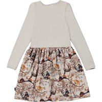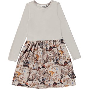 Casie är en långärmad jerseyklänning med rundad kjol i ekologisk bomull. Klänningens topp är ribbad jersey i ljusgrå, medan kjolen är i poplin med olika djurungar som lever tillsammans i fred och harmoni.