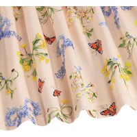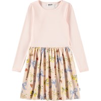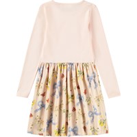 Rosa långärmad klänning i mjuk ekologisk bomullsjersey. Toppen har en åtsittande passform i ribbad jersey, och kjolen är gjord av stretchig jersey med fjärilar och färgglada blommor. Det är en bekväm klänning med gott om utrymme för rörelse.
