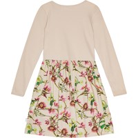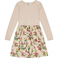 Puderfärgad långärmad klänning i ekologisk bomull, som kombinerar en åtsittande topp i ribbad jersey med en slät jerseykjol. Klänningen är lätt att ta på och ger gott om utrymme för lek och rörelse. Klänningens kjol har ett heltryck av julrosor i vitt och ljusrosa nyanser, som elegant flätar sig samman med sina gröna blad.