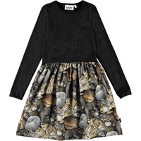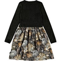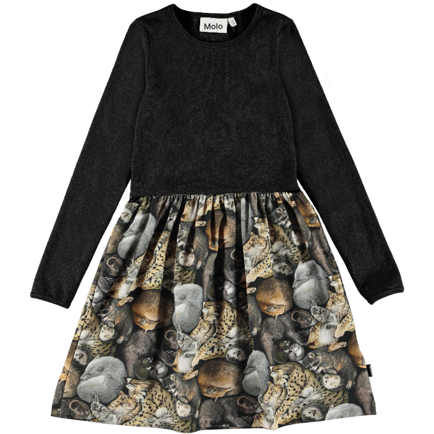 Credence är en långärmad klänning med grå överdel i ribb och kjol med olika sovande djur.
