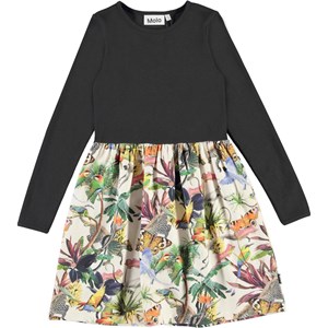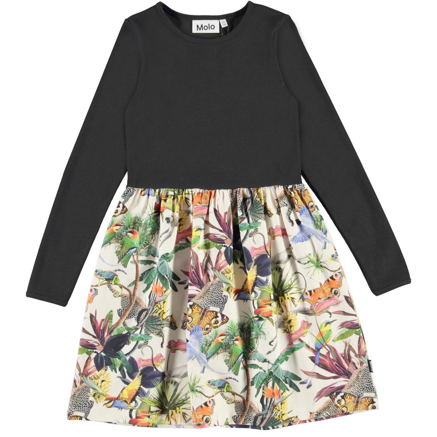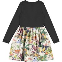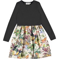 Credence är en långärmad klänning med svart överdel i ribb och kjolen i mönstret "Imaginary Djungel" som är med fina färgrika djur.