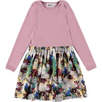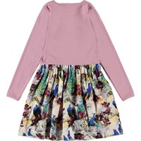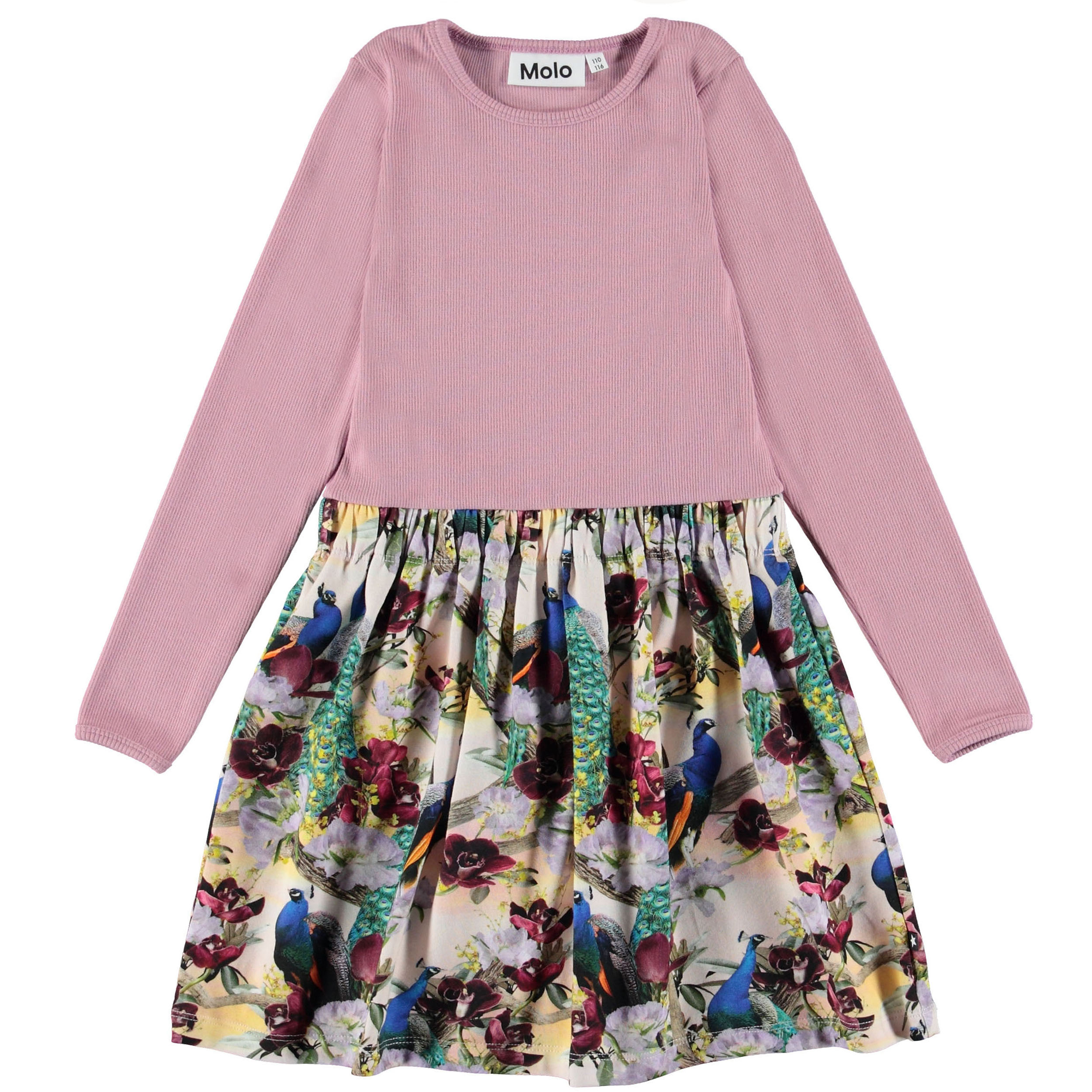 Credence är en långärmad klänning i tvådelat look med ljusgrå ribbad överdel och all over tryckt kjol med trycket 'Oriental Peacocks'.