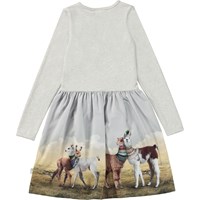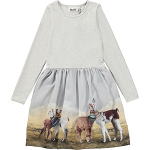 Ljusgrå knälång klänning med långa ärmar och lamamönster. Här ses söta och roliga lamor som är fulla av humor. De har fått på sig Molo´s egna stickade plagg och är ordentligt påklädda i mössor, halsdukar och tröjor. Denna klänning är tillverkad i 100% bomull, har rund hals, långa ärmar, påsyddkjol med mönster och en normal passform.