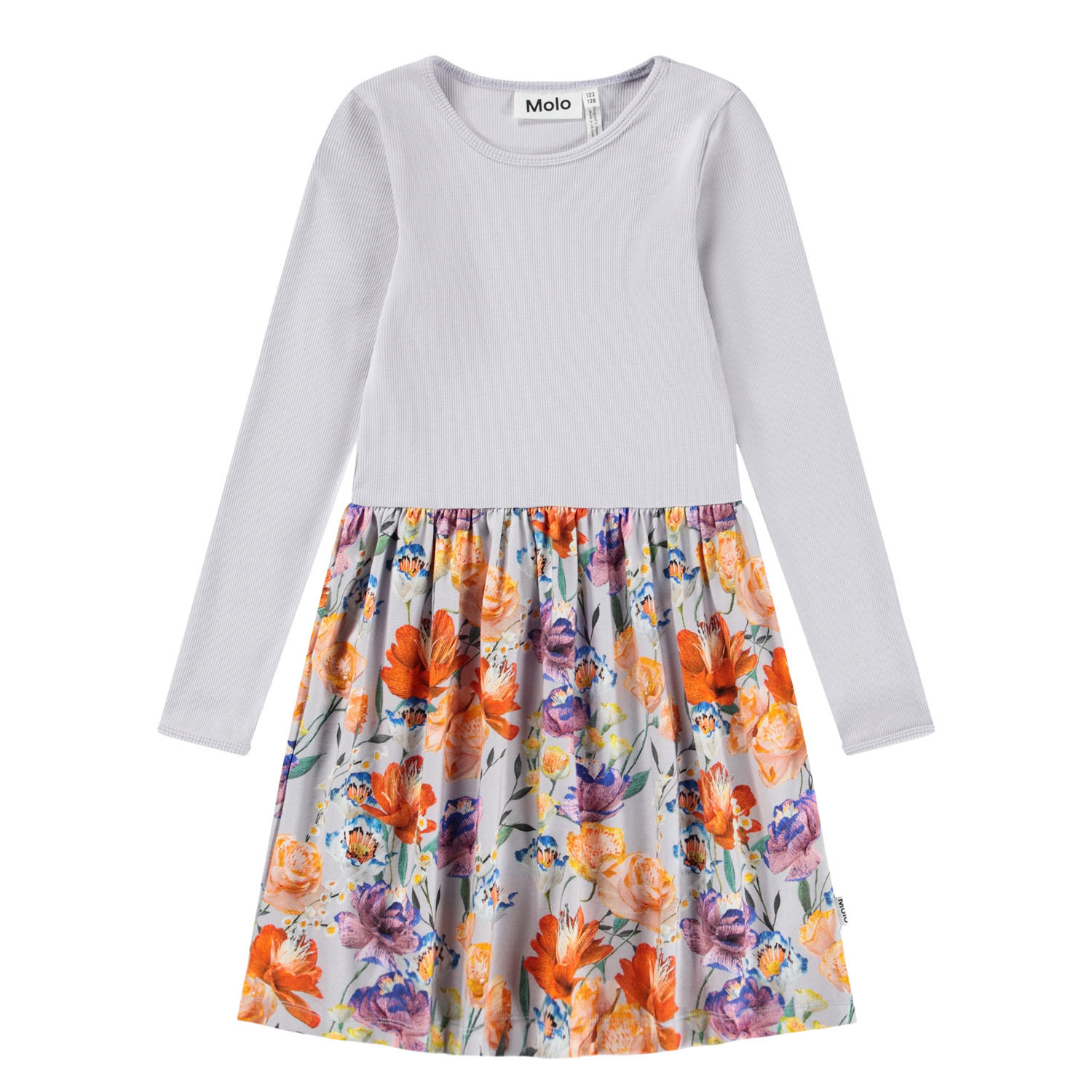Ljuslila långärmad klänning i ekologisk bomull, med en åtsittande topp i ribbad jersey och en slät jerseykjol. Klänningen är lätt att ta på och har gott om utrymme att leka och röra sig i. Kjolen har ett mönster av färgglada blommor.