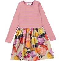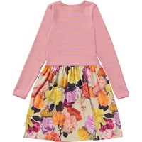 Casie är en långärmad jerseyklänning med rundad kjol i ekologisk bomull. Klänningens topp är ribbad jersey i rosa med orange ränder, medan kjolen är i poplin med rosor i all världens färger.