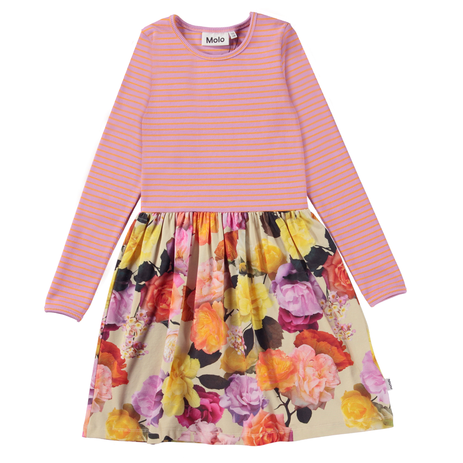 Casie är en långärmad jerseyklänning med rundad kjol i ekologisk bomull. Klänningens topp är ribbad jersey i rosa med orange ränder, medan kjolen är i poplin med rosor i all världens färger.