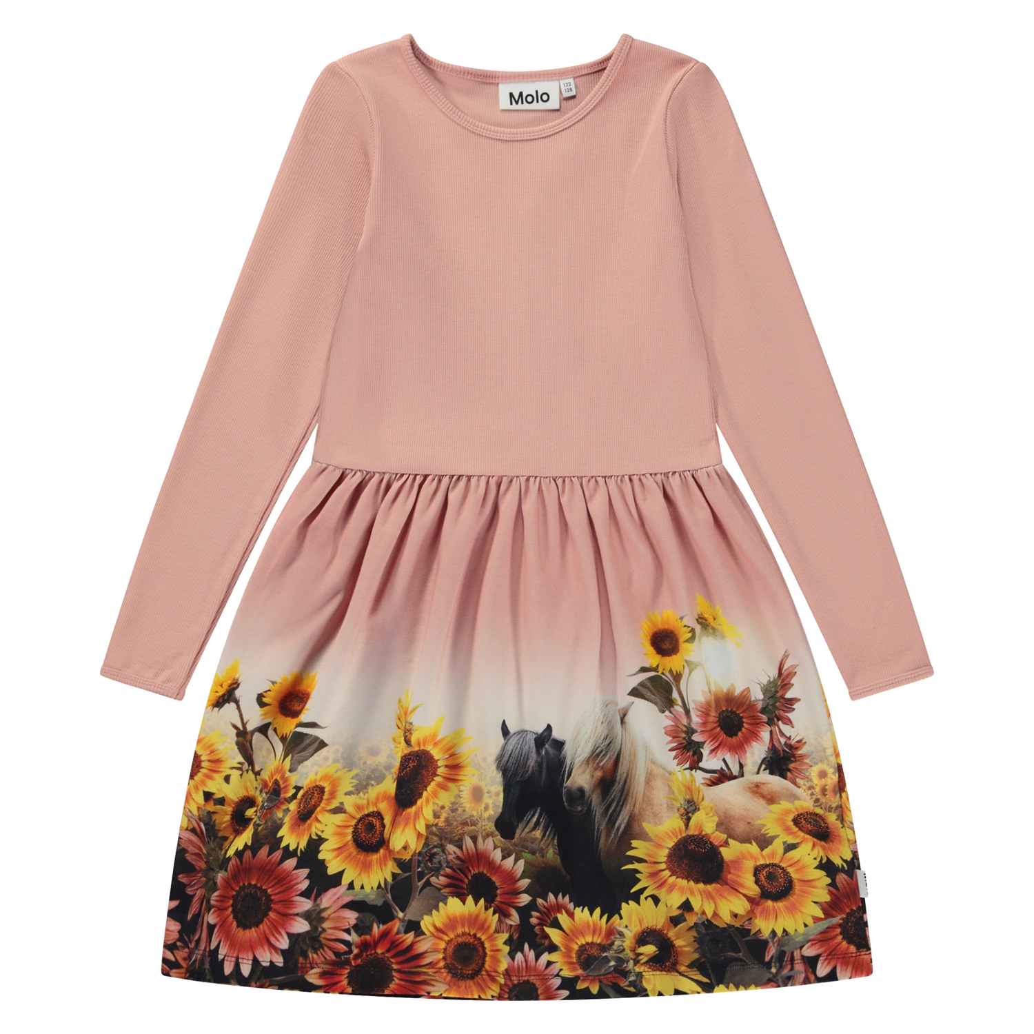 Rosa knälång klänning med långa ärmar och blommor och ponnyer. Här ses två hästar som myser på en mark full av solrosor. Denna klänning är tillverkad i 100% bomull, har rund hals, långa ärmar, påsyddkjol med mönster och en normal passform.