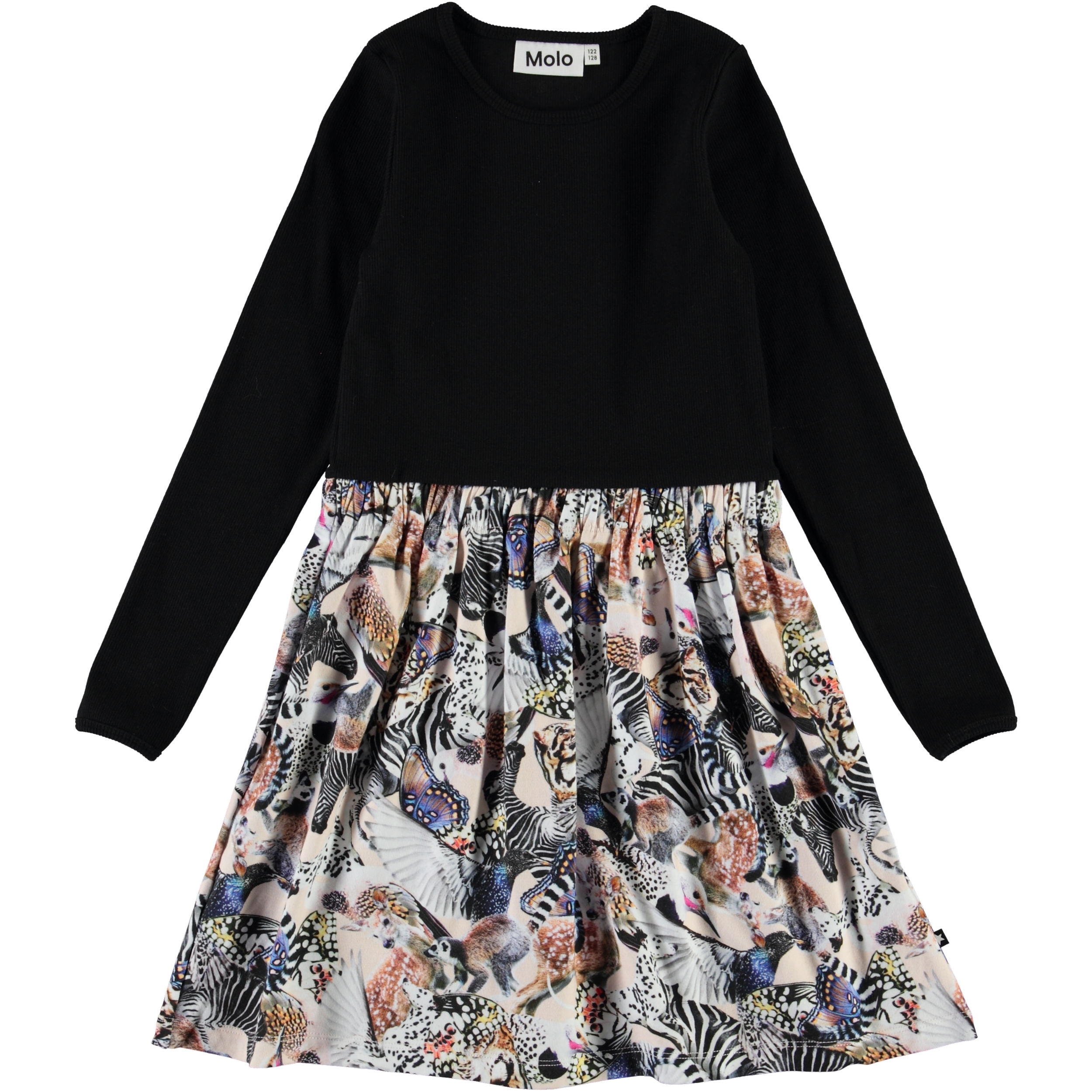 Credence är en tvådelad klänning med en svart ribbad överdel och en underdel med olika djur som bildar ett vackert mönster.
