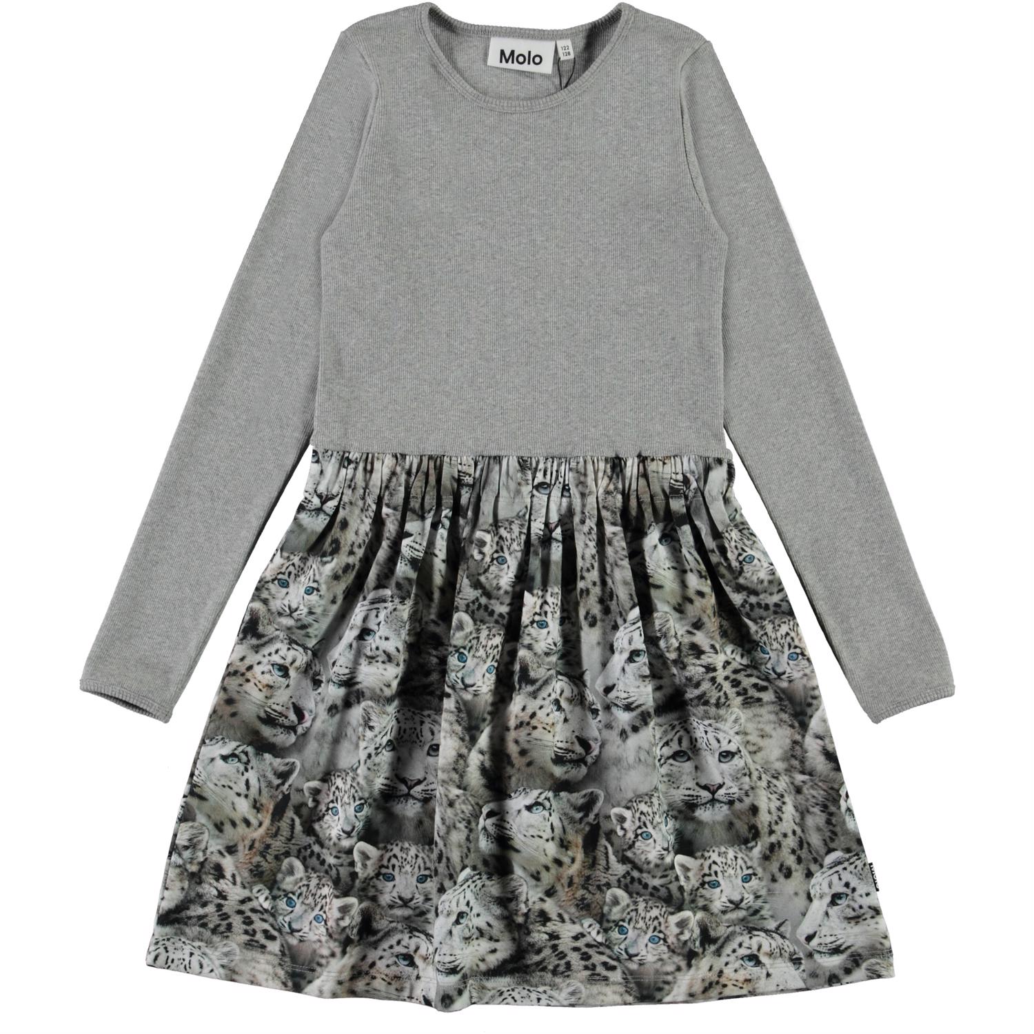Credence är en tvådelad långärmad klänning med ribbad topp i grått. Klänningens kjol är med ett tryck av vackra snöleoparder.
