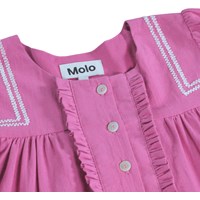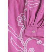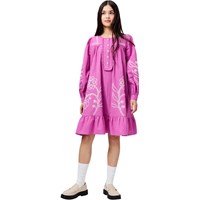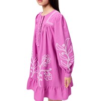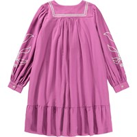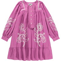 Lila klänning i mjuk bomull, med fina volangdetaljer. Klänningen har en oversized passform, knäppning framtill och handgjorda broderier på framsidan och ärmarna.