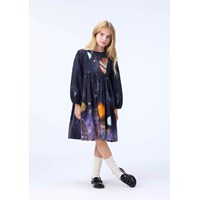 Knälång svart klänning i ekologisk bomull med rund hals och långa ärmar, som har resår i ärmsluten. Toppen är designad med paneler och kjolen har veck som ger klänningen volym. Den osynliga dragkedjan på baksidan gör den enkel att ta på sig. Klänningen har ett mönster av universum och planeter.