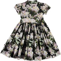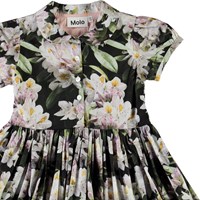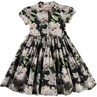 Cybil är en blommig skjortklänning med korta ärmar, krage och knappstängning i nacken. Klänningen har en fin volym i kjolen.
