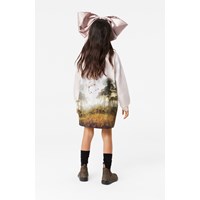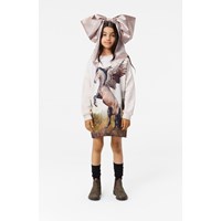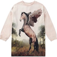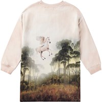 Puderfärgad jerseyklänning i mjuk ekologisk bomull. Klänningen är knälång och har en lös passform med ribbade kanter vid halsen och ärmarna. Klänningen har ett tryck av en vacker bruntonad häst.