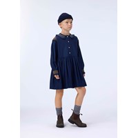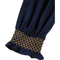 Klänning med långa ärmar i mörkblå viskos med färgglada smockdetaljer vid kragen, axlarna och ärmkanterna. Klänningen har en knäppning framtill och en rynkad kjol som ger volym och liv åt klänningen.